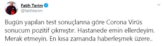 Galatasaray Teknik Direktörü Fatih Terim, Twitter hesabından yaptığı açıklamada, koronavirüs test sonucunun pozitif çıktığını duyurdu. Terim, paylaşımında “Bugün yapılan test sonuçlarına göre Corona Virüs sonucum pozitif çıkmıştır. Hastanede emin ellerdeyim. Merak etmeyin. En kısa zamanda haberleşmek üzere” ifadelerini kullandı.