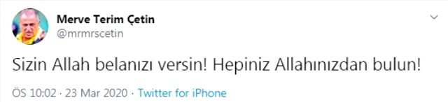 Galatasaray’da Teknik Direktör Fatih Terim’in koronavirüse yakalandığını açıklamasının ardından kızından büyük tepki geldi. Fatih Terim’in kızı Merve Terim Çetin, “Sizin Allah belanızı versin! Hepiniz Allahınızdan bulun!” ifadelerini kullandı.