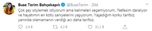 Buse Terim babasının koronavirüse yakalanmasına ilişkin Twitter’dan yaptığı açıklamada, “Çok şey söylemek istiyorum ama kelimeleri seçemiyorum.. Nefesim daralıyor ve hayatımın en kötü saniyelerini yaşıyorum. Yaşadığım korku tarifsiz, yanında olamamanın verdiği acı daha tarifsiz” ifadelerine yer verdi.