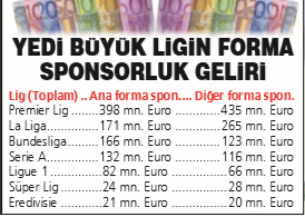 AVRUPA’NIN yedi büyük ligindeki kulüplerin forma sponsorluk gelirlerini inceleyen KPMG Football Benchmark ekibi ilginç bilgilere ulaştı. İngiltere Premier Ligi kulüpleri, toplam 833 milyon Euro’luk forma sponsorluk geliriyle Avrupa lideri. Süper Lig ise 24 milyon Euro ile çok gerilerde.