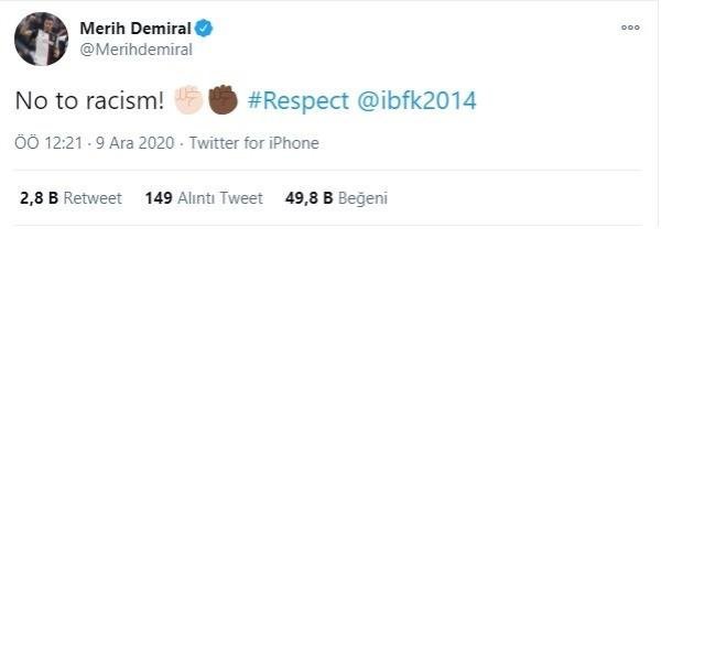 Fransa’nın Lille takımında forma giyen Yusuf Yazıcı ‘No To Racism’ notu ile paylaşım yaparken, Mehmet Zeki Çelik ise saygı anlamına gelen ‘Respect’ kelimesi ile Başakşehir’e destek oldu.