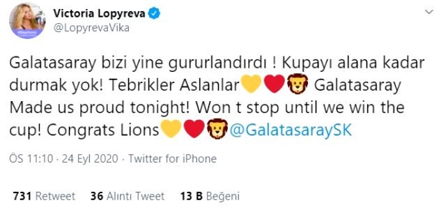 Galatasaray taraftarlığıyla bilinen Rus model ve TV sunucusu Victoria Lopyreva, sarı kırmızılıların UEFA Avrupa Ligi’ndeki Hajduk Split galibiyeti sonrasında kişisel twitter hesabından Türkçe mesaj yayınladı.
