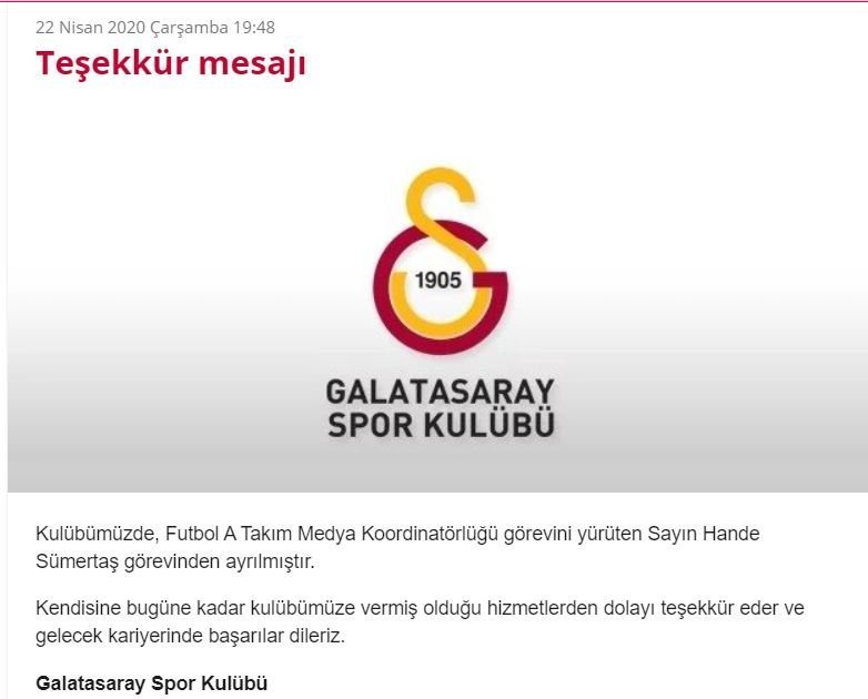 Sarı kırmızılı kulüpten yapılan açıklamada, “Kulübümüzde, Futbol A Takım Medya Koordinatörlüğü görevini yürüten Sayın Hande Sümertaş görevinden ayrılmıştır. Kendisine bugüne kadar kulübümüze vermiş olduğu hizmetlerden dolayı teşekkür eder ve gelecek kariyerinde başarılar dileriz” ifadeleri yer aldı.
