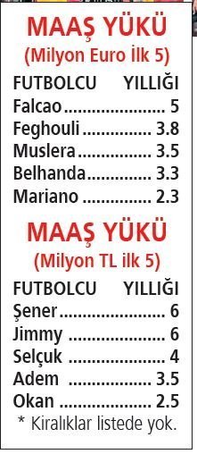 Bunun için ilk olarak Falcao, Feghouli, Muslera ve Belhanda gibi yüksek ücret alan isimlerle masaya oturulacak, yüzde 20 indirim artı bonuslardan feragat istenecek. Futbolcular veya temsilcileriyle yapılacak görüşmelerde orta yol bulunmazsa ‘ayrılık’ gündeme gelebilir.