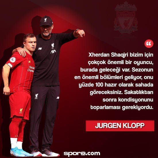 Liverpool Menajeri Jürgen Klopp, Xherdan Shaqiri’nin en önemli oyuncularından biri olduğunu söylerken Ada basını ise Galatasaray’ı adres göstermiş oldu. Alman hoca, “Xherdan Shaqiri bizim için çok, çok önemli bir oyuncu, burada geleceği var. Sezonun en önemli bölümleri geliyor, onu yüzde 100 hazır olarak sahada göreceksiniz. Sakatlıktan sonra kondisyonunu toparlaması gerekiyordu” sözlerini kullanmıştı