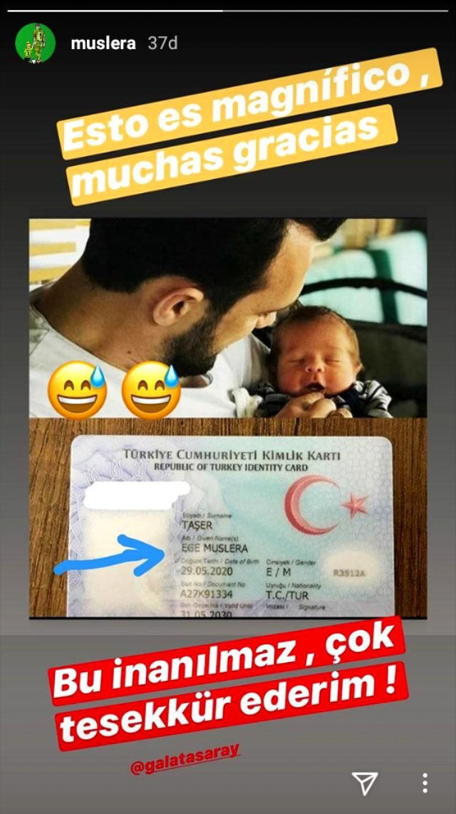 Fanatik Galatasaraylı bir taraftar, oğluna Ege Muslera adını koydu. Bunu öğrenen Uruguaylı kaleci Fernando Muslera, kişisel Instagram hesabındaki hikaye bölümünden taraftara teşekkür etti.