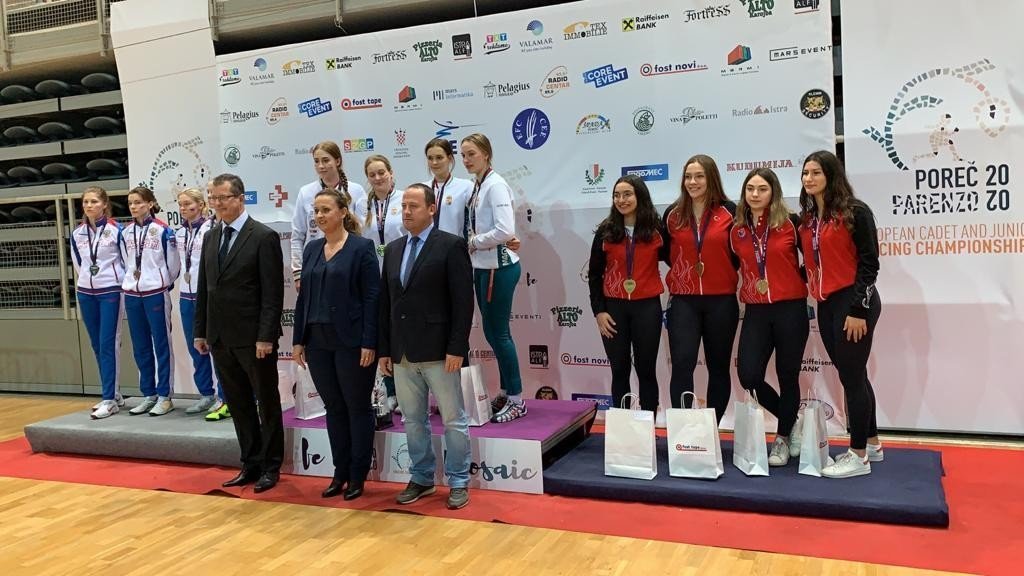 Hırvatistan’ın Porec kentinde 22 Şubat’tan bu yana devam eden ‘Yıldızlar ve Gençler Avrupa Eskrim Şampiyonası’nda bugün takım müsabakalarında ülkemizi temsil eden ‘Nisanur Erbil, Deniz Selin Ünlüdağ, Aylin Çakır ve Tuğçe Rana Kaya’dan kurulu ‘Genç Kadınlar Kılıç Milli Takımımız’ Romanya’yı 45-41 mağlup ederek bronz madalyanın sahibi oldu.