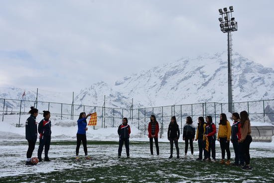 Kursta 9 günlük teorik eğitimin ardından sahada uygulamalı eğitime katılan 15 kız öğrenci, Çınar Çiftçi’nin nezaretinde soğuk havada ve karla kaplı zeminde hakemliğin tüm inceliklerini öğreniyor.