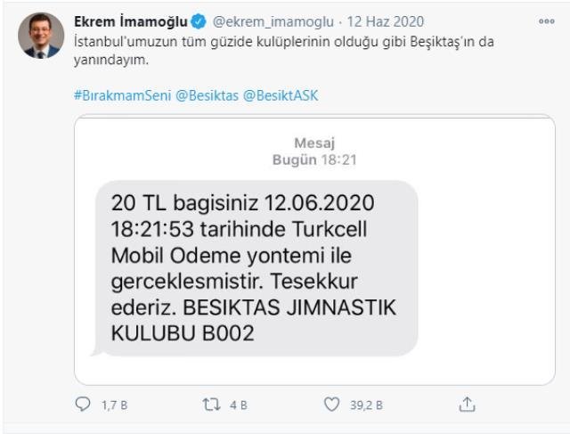 Öte yandan İBB Başkanı daha önce Beşiktaş’ın başlattığı ‘Bırakmam Seni’ bağış kampanyasına da katılmıştı. İmamoğlu yaptığı açıklamada, “İstanbul’umuzun tüm güzide kulüplerinin olduğu gibi Beşiktaş’ın da yanındayım” ifadelerine yer vermişti.