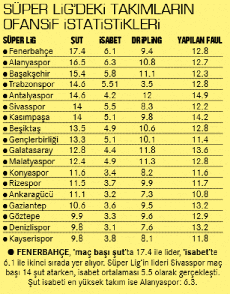 Fenerbahçe’nin ilk devrede savunma göbeğinde bir istikrar sağlayamadığı malum. Rami’nin İstanbul kariyeri adeta 45 dakikada bitti. Zanka sakatlık sonrası isteksiz ve yavaş bir dönüş yaptı. Sadık sakatlandı. Ancak savunma göbeğindeki bu sorunlara rağmen Fenerbahçe’nin ilk yarıda rakiplerine verdiği şut fırsatı sayısı 151. Bu da Alanyaspor’dan sonra ligin en düşük sayısı.