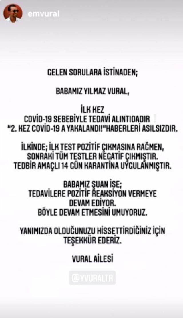 Oksijen ihtiyacının artması üzerine, cuma günü öğle saatlerinde yoğun bakım ünitesine alınarak ventilatör altında durumu takip edilen Yılmaz Vural hakkında ailesinin sosyal medyadan yaptığı açıklamada, “Babamız Yılmaz Vural COVID-19 sebebiyle tedavi altındadır. 2. kez Covid-19’a yakalandı şeklindeki haberler asılsızdır. İlkinde ilk test pozitif çıkmasına rağmen sonraki tüm testler negatif çıkmıştır. Tedbir amaçlı 14 gün karantina uygulanmıştır. Babamız şu an ise tedavilere pozitif reaksiyon vermeye devam ediyor. Böyle devam etmesini umuyoruz. Yanımızda olduğunuzu hissettirdiğiniz için teşekkür ederiz” ifadeleri kullanıldı.