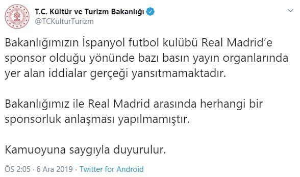 “Bakanlığımızın İspanyol futbol kulübü Real Madrid’e sponsor olduğu yönünde bazı basın yayın organlarında yer alan iddialar gerçeği yansıtmamaktadır. Bakanlığımız ile Real Madrid arasında herhangi bir sponsorluk anlaşması yapılmamıştır.”