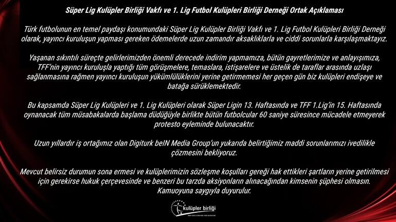 Kulüpler Birliği, yayıncı kuruluşun ödemeleri aksatmaları sebebiyle Süper Lig’in 13. haftasında ve TFF 1. Lig’in 15. haftasında oynanacak tüm müsabakalarda başlama düdüğüyle birlikte bütün futbolcular 60 saniye süresince mücadele etmeyerek protesto eyleminde bulunacaklarını açıkladı.