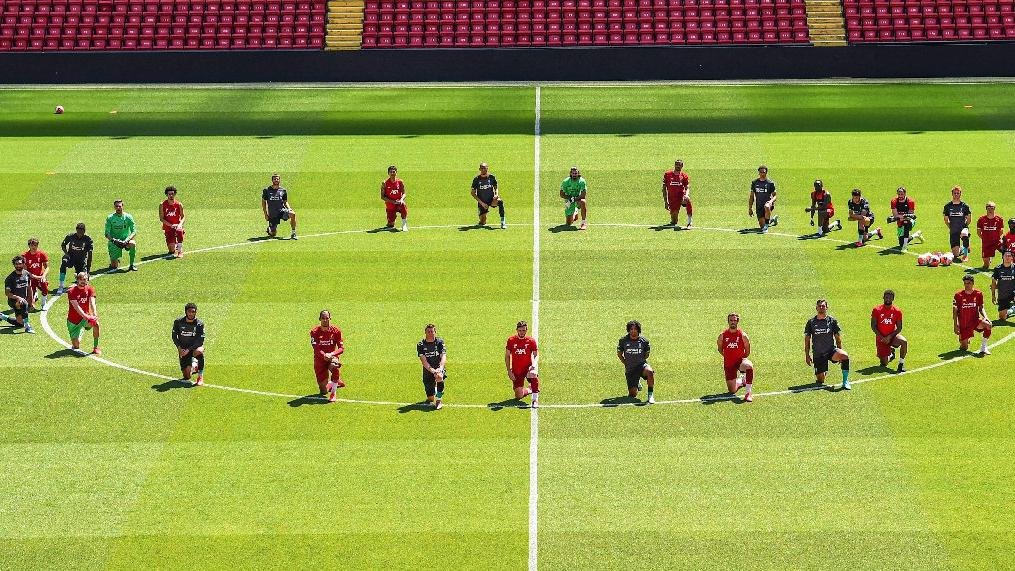 Anfield Road’da orta sahada çember oluşturarak diz çöken Liverpool futbolcuları adalet çağrısında bulunurken, Twitter’da yapılan paylaşımda “Birlik kuvvettir” ifadeleri kullanıldı ve #blacklivesmatter etiketi kullanıldı.