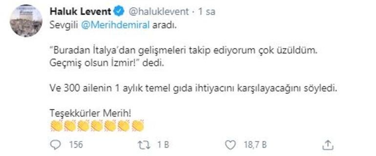 Sanatçı Haluk Levent sosyal medya hesabından yaptığı paylaşımda; “Buradan İtalya’dan gelişmeleri takip ediyorum çok üzüldüm. Geçmiş olsun İzmir!” dedi. Ve 300 ailenin 1 aylık temel gıda ihtiyacını karşılayacağını söyledi. Teşekkürler Merih!” ifadelerini kullandı.