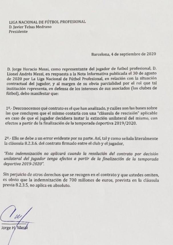 “Profesyonel futbolcu Lionel Andres Messi’nin temsilcisi olan ben Jorge Horacio Messi, Ulusal Futbol Ligi’nin 30 Ağustos 2020’de yaptığı açıklamaya istinaden bu bilgilendirmeyi geçiyorum.