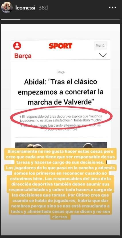 Messi, kulübün Sportif Direktörü Eric Abidal’in “”Mutsuz oyuncular vardı. Takım içi iletişimde sorunlar vardı ve antrenmanda iyi çalışılmıyordu. Eski bir futbolcuysan bunu hissedersin ve bazı detayları görebilirsiniz. Ben de kulübümle görüşlerimi paylaştım. El Clasico’dan sonra Ernesto Valverde’nin kulüpten ayrılması hızlandı. Bir çok oyuncu da durumdan memnun değildi ve bunu istedi” sözlerine Instagram hesabından yanıt verdi.
