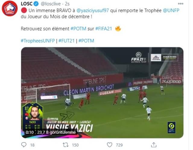 Lille takımı, Twitter hesabından yaptığı açıklamada, Yusuf Yazıcı’yı bu ödülü nedeniyle tebrik etti.