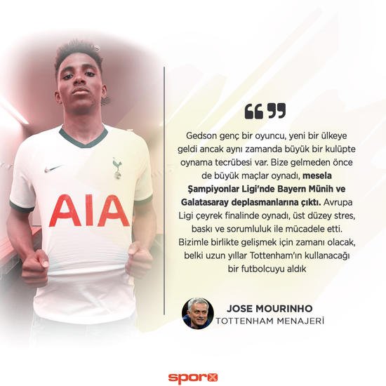 Portekizli hoca, “Gedson genç bir oyuncu, yeni bir ülkeye geldi ancak aynı zamanda büyük bir kulüpte oynama tecrübesi var. Bize gelmeden önce de büyük maçlar oynadı, mesela Şampiyonlar Ligi’nde Bayern Münih ve Galatasaray deplasmanlarına çıktı. Avrupa Ligi çeyrek finalinde oynadı, üst düzey stres, baskı ve sorumluluk ile mücadele etti. Bizimle birlikte gelişmek için zamanı olacak, belki uzun yıllar Tottenham’ın kullanacağı bir futbolcuyu aldık” dedi.