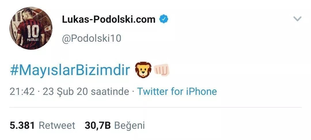 Bir dönem Galatasaray’da forma giyen Lukas Podolski, derbi maçı sonrasında sosyal meydal hesabından aslan logosu kullanarak “Mayıslar bizimdir” paylaşımı yaptı. Bu paylaşım, diğer takım taraftarlarının Podolski’ye tepki göstermesine sebep oldu. Podolski’nin formasını giydiği Antalyaspor 17 Mayıs’ta ligin son haftası Galatasaray’ı sahasında ağırlayacak olması yapılan bu paylaşımın eleştirilmesine sebep oldu.