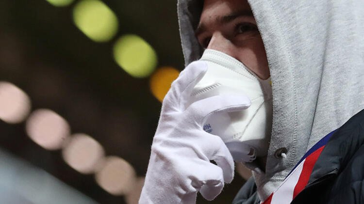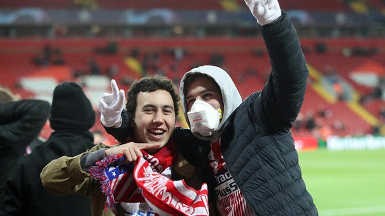 Anfield Road’da takımlarını yalnız bırakmayan Atletico Madrid taraftarları da corona virüse karşı önlem alarak maske taktılar.