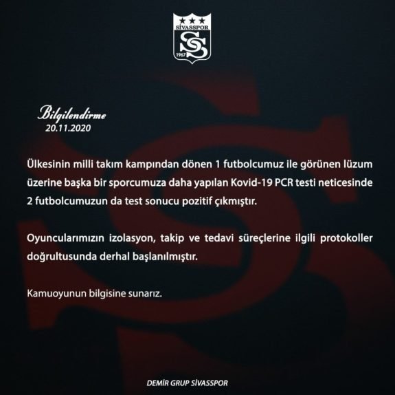 Sivasspor Kulübü’nden konuyla ilgili yapılan açıklamada, “Ülkesinin milli takım kampından dönen 1 futbolcumuz ile görünen lüzum üzerine başka bir sporcumuza daha yapılan Covid-19 PCR testi neticesinde 2 futbolcumuzun da test sonucu pozitif çıkmıştır. Oyuncularımızın izolasyon, takip ve tedavi süreçlerine ilgili protokoller doğrultusunda derhal başlanılmıştır. Kamuoyunun bilgisine sunarız” ifadesi kullanıldı.
