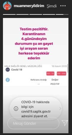 “Testim pozitiftir. Karantinanın 4. günündeyim. Durumum şuan gayet iyi. Arayan soran herkese teşekkür ederim.”