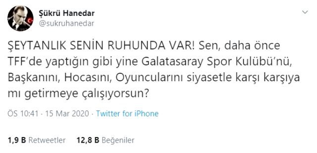 Hanedar, sosyal medya hesabından yaptığı paylaşımda, “Şeytanlık senin ruhunda var! Sen, daha önce TFF’de yaptığın gibi yine Galatasaray Spor Kulübü’nü, Başkanını, Hocasını, Oyuncularını siyasetle karşı karşıya mı getirmeye çalışıyorsun?” ifadelerini kullandı.