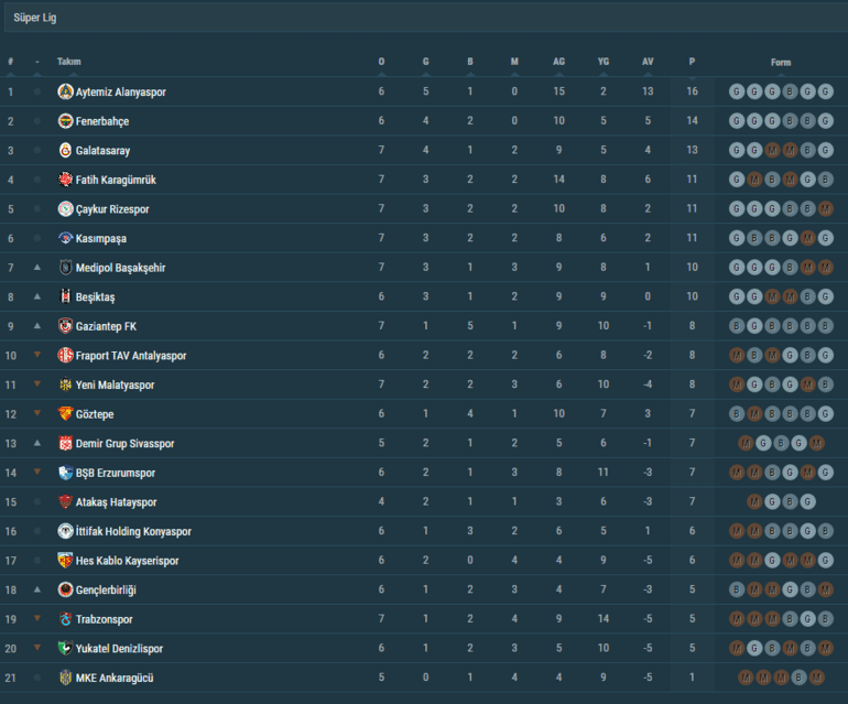 Süper Lig’de 7. hafta bu akşam oynanacak olan ik müsabakanın ardından tamamlanacak. Hatayspor sahasında Avrupa Ligi’nden dönen Sivasspor’u konuk ederken Antalyaspor ise sahasında Fenerbahçe’yi konuk edecek. Bu hafta Galatasaray ve Beşiktaş sahalarında oynadıkları müsabakaları attıkları tek golle kazanırken haftanın en gollü maçlarından biri olan Trabzonspor-Kasımpaşa maçı son düdüğe kadar oldukça çekişmeli geçti. İşte Süper Lig’de 7. haftanın ardından oluşan puan durumu ve günün maçları…