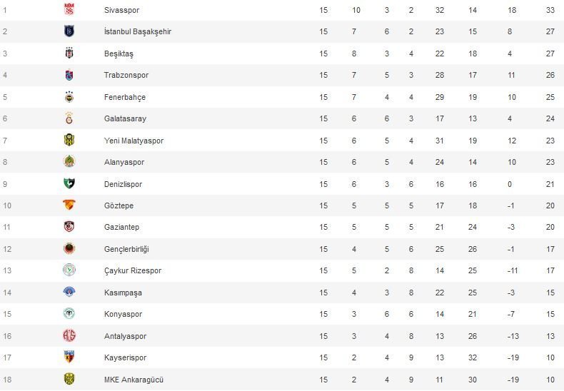 Süper Lig’de 15. hafta sonuçları şöyle: