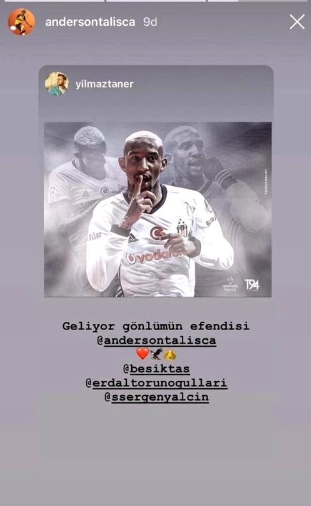 Çin Süper Ligi takımlarından Guangzhou Evergrande forması giyen Anderson Talisca‘nın Beşiktaş yöneticisi Erdal Torunoğulları‘nı arayarak siyah beyazlılara dönmek istediği ortaya çıkmıştı. Anderson Talisca’nun paylaşımı ‘Beşiktaş’a geliyor’ iddialarını güçlendirdi.