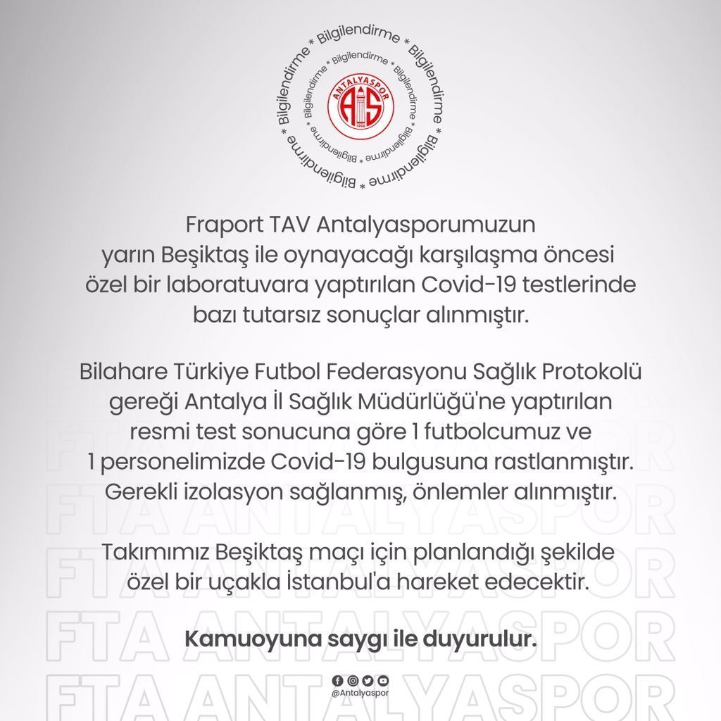 “Fraport TAV Antalyasporumuzun yarın Beşiktaş ile oynayacağı karşılaşma öncesi dün ve bu sabah özel bir laboratuvara yaptırılan Covid-19 testlerinde bazı tutarsız sonuçlar alınmıştır.