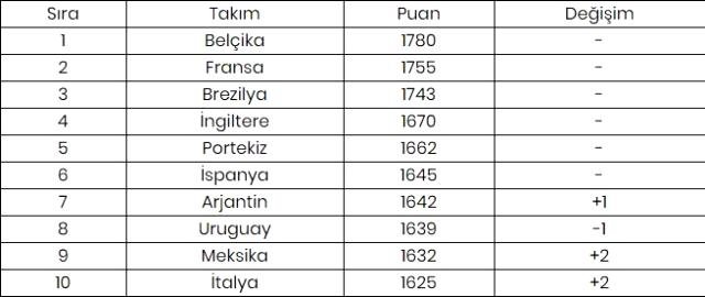 Klasmanın ilk 3 sırasında değişiklik yaşanmadı. Liderlik koltuğunda oturan Belçika’yı, Fransa ve Brezilya takip etti.