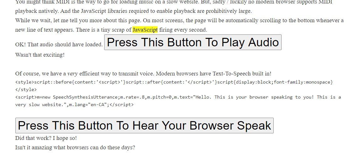 Very Slow Website” isimli site, bizlere 90’lı yıllarda insanların nasıl internete bağlandığını gösteriyor. Metinler yüklenirken bile son derece yavaş kalan bu internet sitesi, günümüzde teknolojinin ne kadar hızlandığını da gözler önüne seriyor. Sadece 968 bayt bir görüntünün bile 40 saniyede yüklenebildiği 90’lı yıllar, günümüz internet sitelerini açmaya kalksa muhtemelen günler boyunca indirmeye devam edecekti.