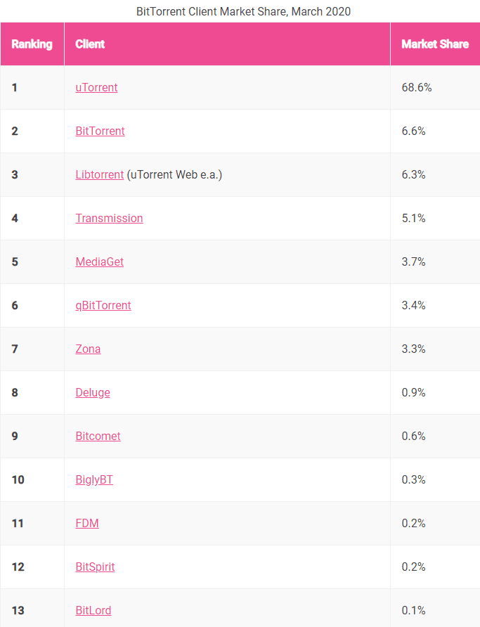 Mart 2020 itibarıyla programların pazar paylarını gösteren listede Rusya’dan Zona ve MediaGet’in de kendilerine yer bulduğu görülüyor. MediaGet, %3,7 gibi bir pazar payına sahipken Zona ise %3,3 ile MediaGet’i oldukça yakından takip ediyor.