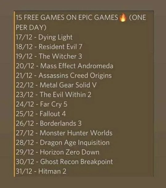 Epic Games tarafından yapılan açıklamalarda, kampanyanın 17 Aralık’ta başlayıp, 31 Aralık’ta verilecek son oyunla biteceği ifade edilmişti. Sosyal medya platformlarında paylaşılan liste, 17 Aralık itibarıyla ücretsiz olarak dağıtılacak oyunları tek tek sıralıyor. Çoğu popüler olan oyunlar, oyuncuların paralarının cebinde kalmasını sağlayacak gibi görünüyor. Ancak listenin henüz resmi olarak onaylanmadığının altını çizelim.
