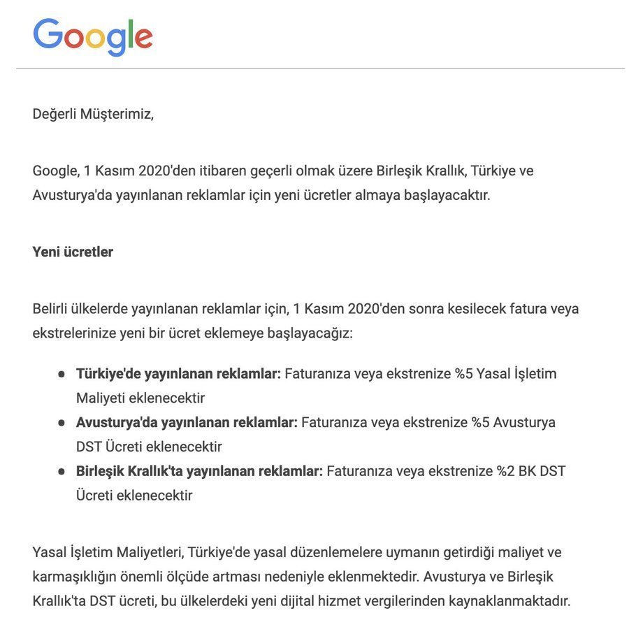 Google tarafından yapılan açıklamada, “1 Kasım 2020 tarihinden itibaren Türkiye’de sunulan reklamlar için bir sonraki faturanıza veya hesap özetinize yüzde 5 Türkiye Yasal İşletme Maliyetleri eklenecektir. Türkiye’deki düzenlemelere uymanın karmaşıklığı ve maliyetindeki önemli artışlar nedeniyle Yasal İşletme Maliyetleri eklenmektedir” ifadelerine yer verildi.