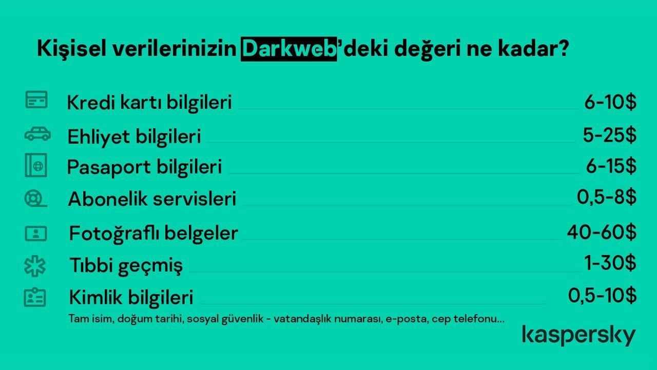 Kaspersky Türkiye tarafından hazırlanan bu görsel, kişisel verilerinizin dark web’deki değerinin ne kadar olduğunu gösteriyor. Buna göre farklı kişisel bilgilerin dark web’deki değeri şu şekilde: