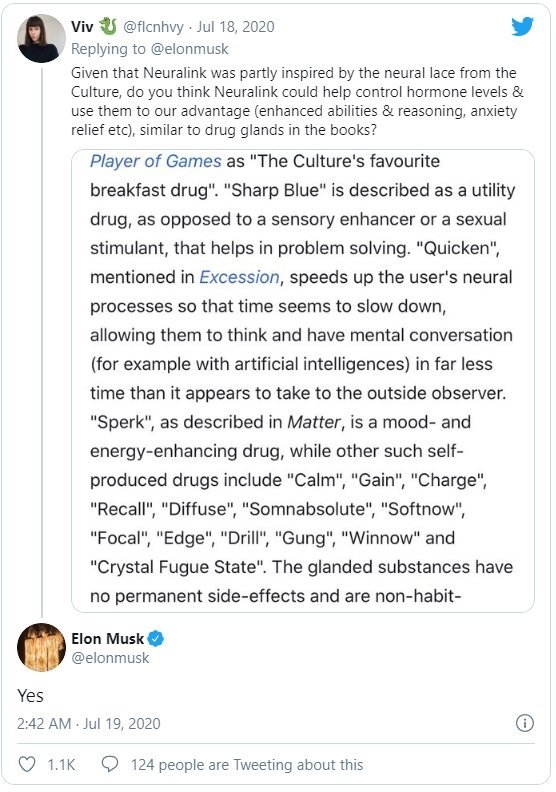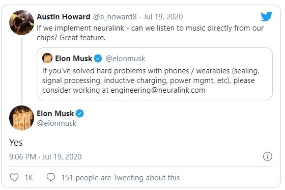 Bir takipçisinin “Neuralink implant edersek, doğrudan (kafamızdaki) çiplerden müzik dinleyebilir miyiz? Harika özellik” tweetine “Evet” şeklinde yanıt veren Musk, çiplerden müzik dinlemenin mümkün olacağına mı yoksa özelliğin harika olduğuna mı evet dediğine açıklık getirmedi.