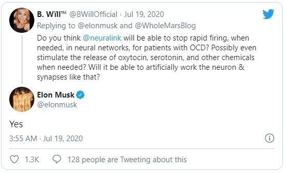 Bir başka takipçisinin “Neuralink, Obsesif Kompulsif Bozukluk (OKB) için gerektiğinde sinir ağlarındaki atışları durdurabileceğini düşünüyor musun? Oksitosin, serotonin ve diğer kimyasalların salgılanması gerektiğinde kişiyi uyarabilir mi? Nöron ve sinapsları yapay olarak çalıştırabilir mi? sorusuna da evet diyen Musk, böylece detay vermese de Neuralink’in nasıl bir potansiyele sahip olduğu konusunda ipucu paylaşmış oldu.