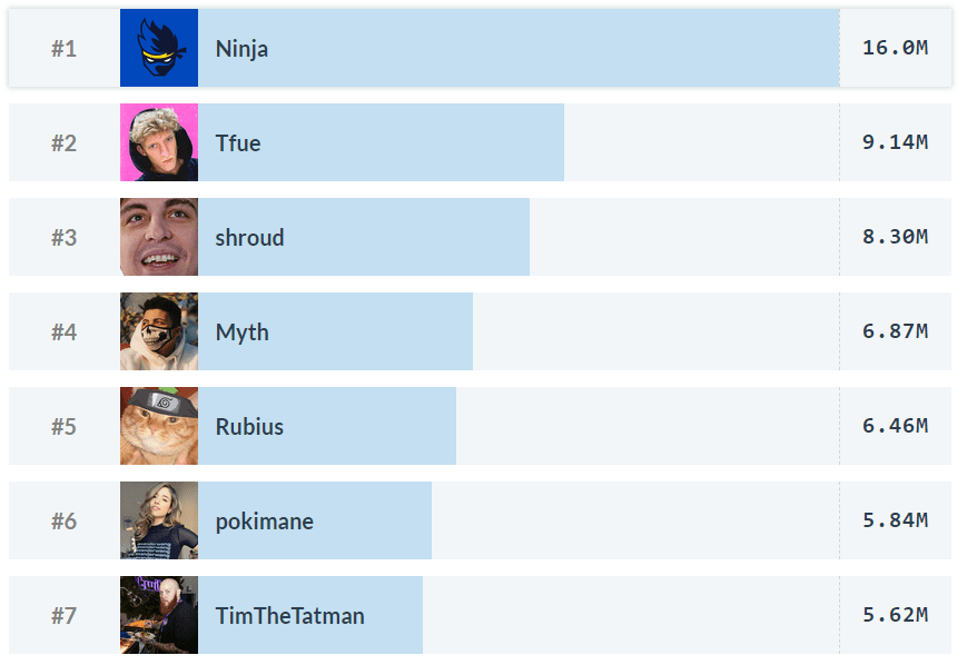 Twitch’teki takipçi sayısında Ninja’yı takip eden yayıncılar 9,14 milyon ile Tfue, 8,3 milyon ile shroud, 6,87 milyon ile Myth oldu. Ayrıca Ninja’nın Twitch’te 16 milyon takipçiye ulaştığını duyuran kişi, eşi Jessica Blevins oldu. Ayrıca Ninja’yı bu başarısı için kutlayanlar arasında Twitch de vardı.