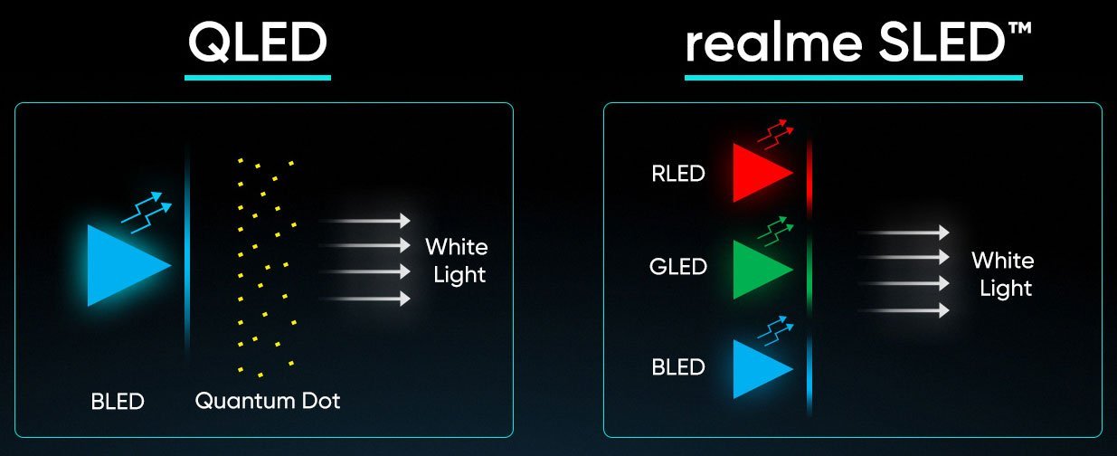 Realme’nin kullandığı SLED teknolojisiyse mavi ışığın yarattığı etkileri azaltabilecek bir yöntem kullanır. Bu teknoloji, mavi ışık yerine kırmızı, yeşil ve mavi ışığı birlikte kullanarak ortaya daha saf bir ışık çıkarır. Yani SLED teknolojisi temelde arka ışık konusunda yeni bir inovasyondur.