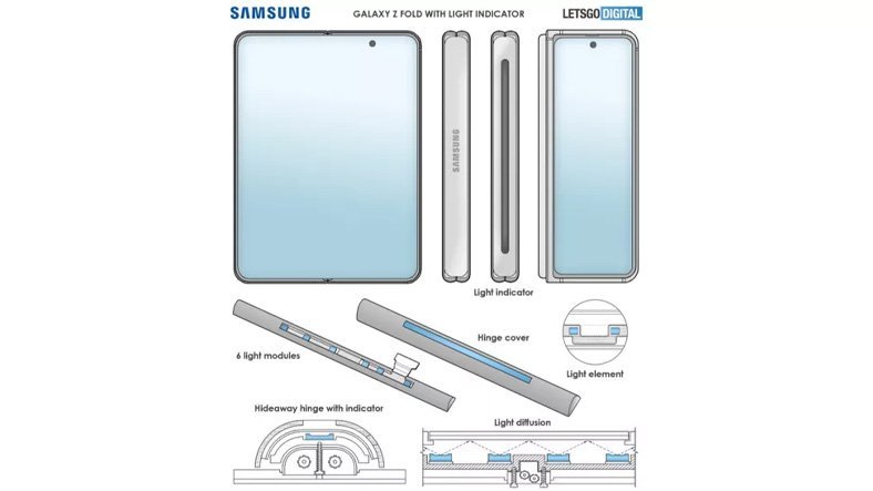 LetsGoDigital tarafından bulunan yeni bir Samsung patentinde, Galaxy Fold2’ye hayli benzeyen bir cihaz yer alıyor. Aralarındaki fark ise telefonun menteşe kısmında LED ışıkların yer alması. Patente göre ışıklar gelen çağrılar ve mesajlar gibi bildirimleri göstermek için kullanılabiliyor.