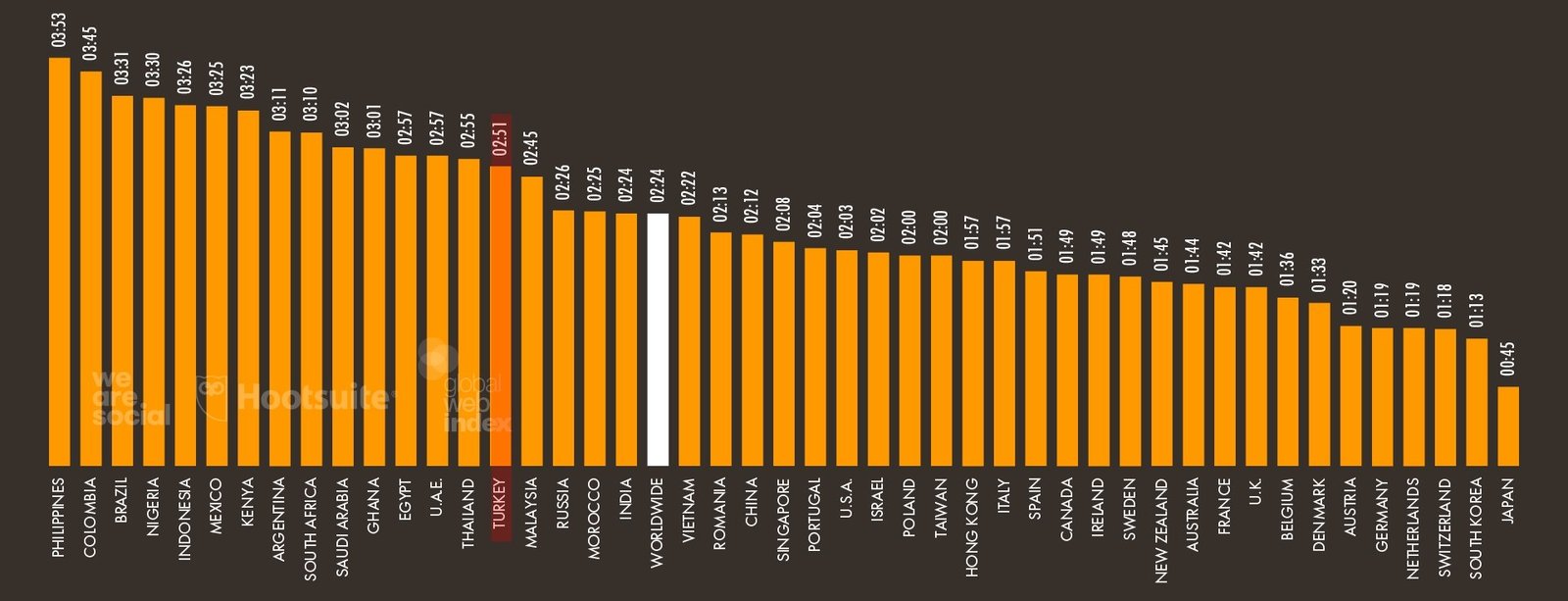 Ülkelere göre sosyal medyada geçirilen süre (günlük)