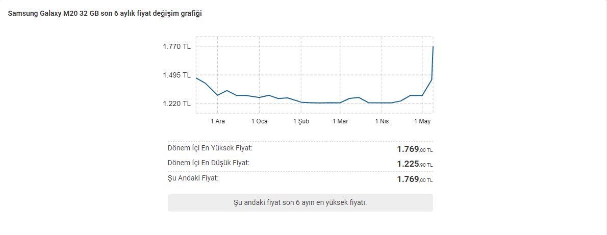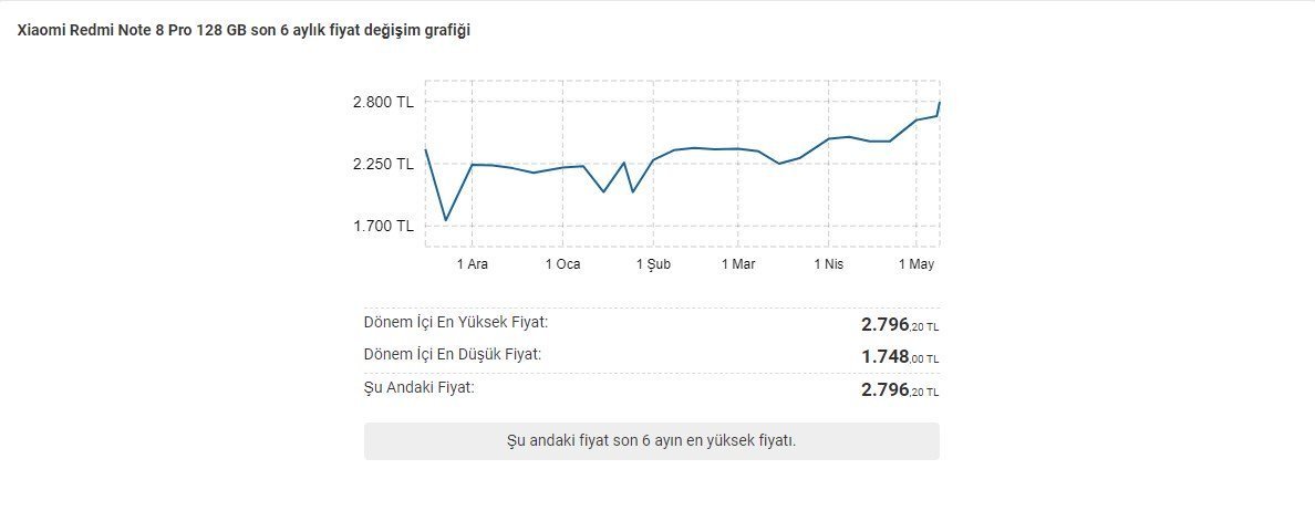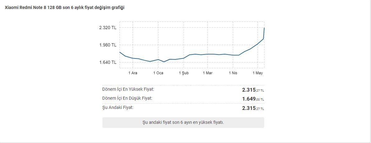 2000 TL’nin altındaki fiyat etiketiyle herkesin gözdesi olan Redmi Note 8, son fiyat artışıyla birlikte artık bu fiyat bandının çok üstüne çıkmış durumda. Öyle ki Ocak 2020’de 1.649 TL’den satışa sunulan akıllı telefon, şu anda 2.315 TL’ye kadar ulaşmış durumda. Telefonun son 6 ay içerisindeki fiyat değişimine yukarıdaki grafikten göz atabilirsiniz.