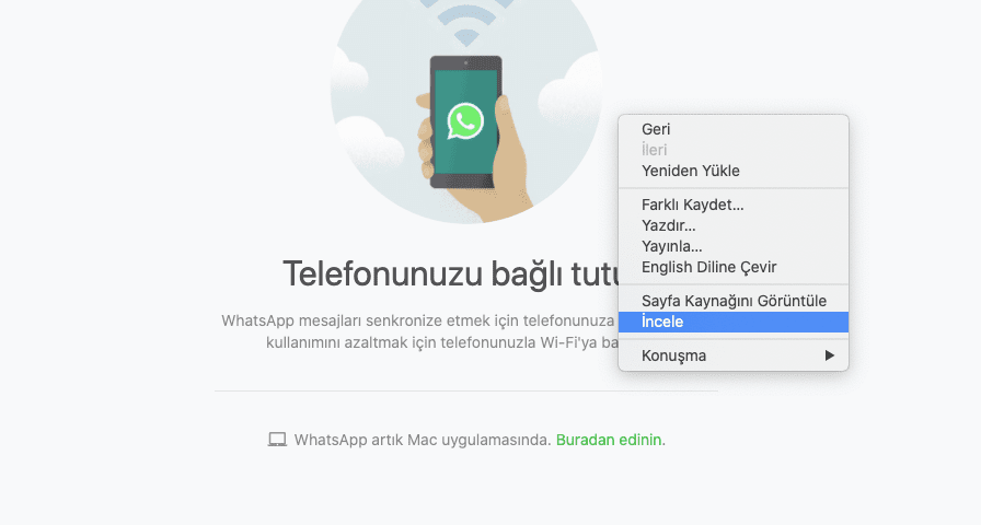 • WhatsApp Web kullanıma hazır olduğu zaman sohbet bölmesinin dış kısmına sağ tıklayın ve buradan ‘İncele’ (Inspect) seçeneğine tıklayın.