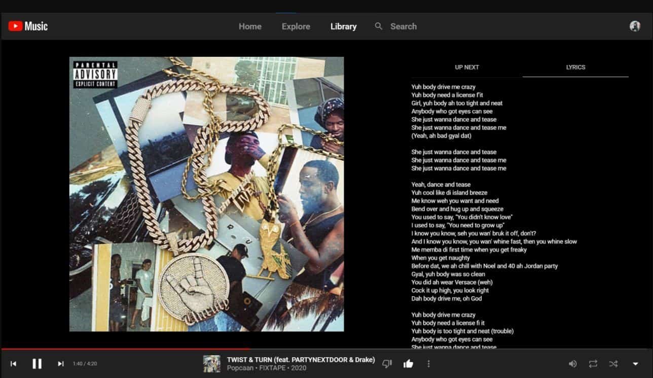 Mobil uygulamadan uyarlanan özellik iki sekmeden oluşuyor. Bu sekmelerden birinde çalma listesinde yer alan parçalar bulunurken diğerinde ise şarkı sözleri bulunuyor. Bu şarkı sözleri üçüncü parti kaynaklardan alınıyor. Bütün şarkılar için şarkı sözü özelliğinin kullanılabilir olup olmadığı ise henüz bilinmiyor.