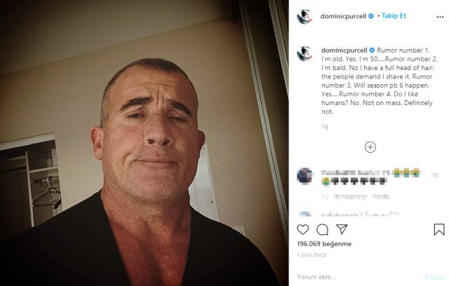 Dizide tutuklu Lincoln Burrows’u canlandıran Dominic Purcell, Instagram hesabından yaptığı bir paylaşımla Prison Break 6. sezonunun olacağını doğruladı. Purcell şifreli paylaşımında “Söylenti 1. Ben yaşlıyım. Evet, 50 yaşındayım… Söylenti 2. Kelim. Hayır, kel değilim saçım var, insanlar tıraş etmemi istiyor. Üçüncü söylenti, 6. sezon olacak. Evet… 4. söylenti. İnsanlardan hoşlanıyor muyum? Hayır. Kitlesel olarak değil. Kesinlikle hayır” dedi.