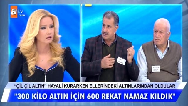 Müge Anlı Musa Cihangir’in de 300 kilo altınla kandırıldığını belirterek harcadıklarını aktardı. Müge Anlı, “105 bin dolar toplamışsınız, tarlasını satmış, 100 tane koyun, 1 traktör ve 1 araba satmış. 70 bin TL’ni de verdin.” diyerek Cihangir’in verdiklerini açıkladı. Cihangir, Anlı’nın “Bunların karşılığında size ne vermeyi vadetti?” sorusuna da “Yüzde 35 bana, 65 Musa’ya. Bir de ortak olması için Neytullah bana 35 bin dolar borçlandı. Senet bende.” dedi. Dikkat çeken açıklamalar yapan Musa Cihangir “300 kilo altın için 600 rekat namaz kıldık” şeklinde konuştu.
