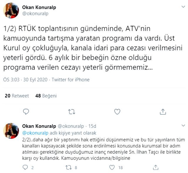Twitter hesabından açıklama yapan Cumhuriyet Halk Partisi RTÜK üyesi Okan Konuralp, “RTÜK toplantısının gündeminde, ATV’nin kamuoyunda tartışma yaratan programı da vardı. Üst Kurul oy çokluğuyla, kanala idari para cezası verilmesini yeterli gördü. 6 aylık bir bebeğin özne olduğu programa verilen cezayı yeterli görmememiz. Daha ağır bir yaptırımı hak ettiğini düşünmemiz ve bu tür yayınların tüm kanalları kapsayacak şekilde sona erdirilmesi konusunda kurumsal bir adım atılması gerektiğine duyduğumuz inanç nedeniyle Sn. İlhan Taşcı ile birlikte karşı oy kullandık. Kamuoyunun vicdanına/bilgisine” dedi.